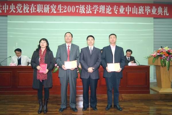 10日下午四点,中共中央党校在职研究生2007级法学理论专业中山班毕业典礼在市委党校培训楼阶梯一室隆重举行。中共广东省委党校副校长陈韩生,中共中山市委常委、组织部部长、党校校长雷彪,中共中央党校函授学院广东分院院长、中共广东省委党校函授学院院长朱康全,中共中山市委党校常务副校长李长春出席典礼并在主席台就座。副校长张平主持毕业典礼。