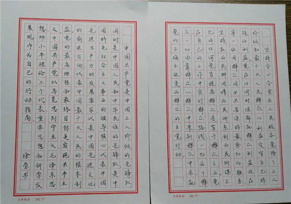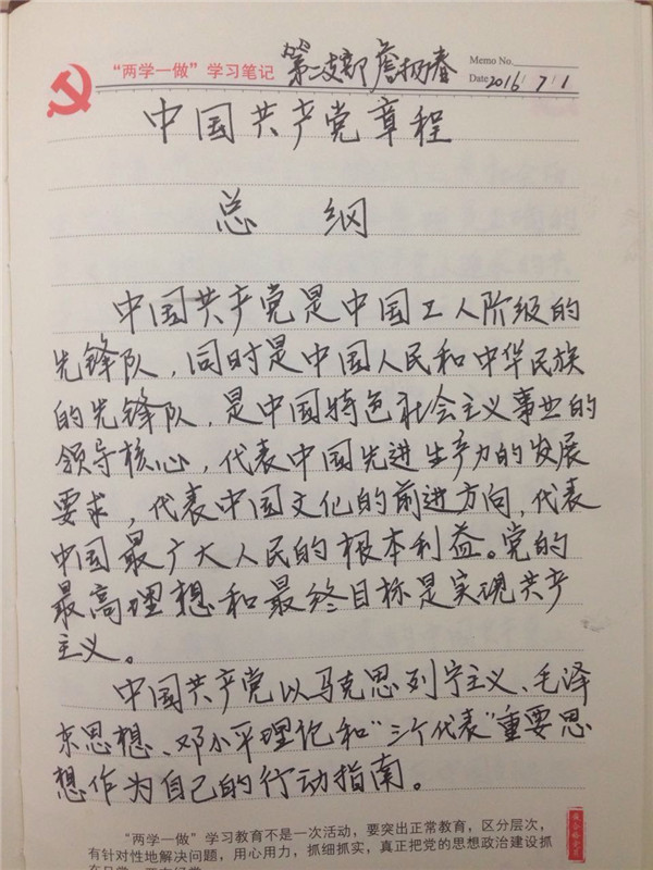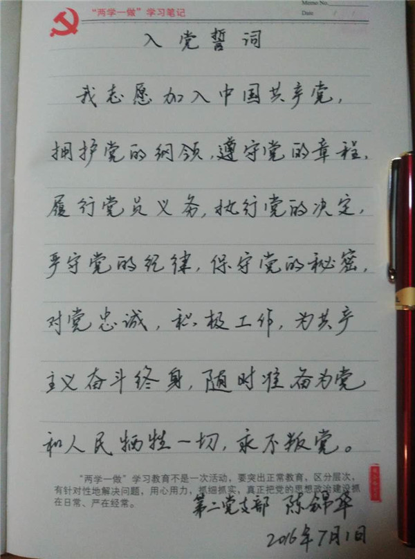自5月我校参加市直属机关工委“两学一做”学习教育硬笔书法作品征集活动以来,我校党员干部按“两学一做”规定要求读原著原文的同时,积极摘抄党章党规、习近平系列重要论述。目前,我校已收到部分党员干部的硬笔书法作品。接下来,我校将继续收集党员干部的硬笔书法作品,与大家分享,以促进党员干部从读原文、摘抄书写原文做起,不断提高觉悟,践行党的宗旨,让“两学一做”成为一种工作常态、一种自觉追求,融为自己的行为习惯。